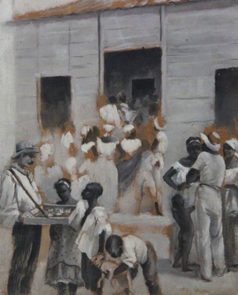 PEDLAR SELLING HIS WARES TO PLANTATION WORKERS