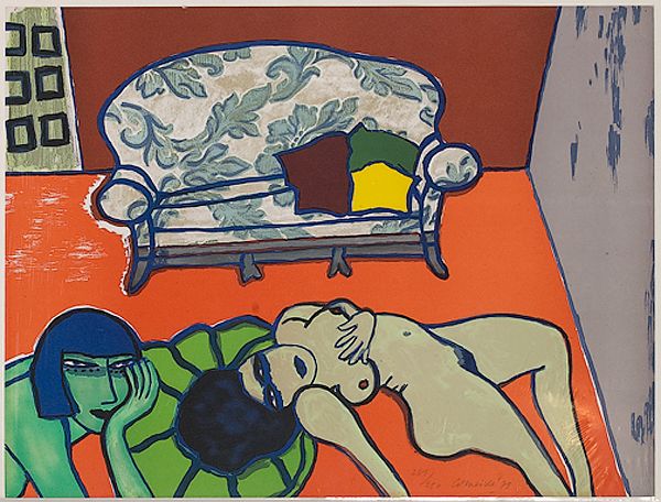 a silkscreen of two reclining nudes in interior setting
