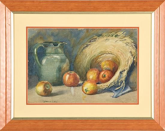 STILL LIFE OF APPLE IN STRAW HAT AND PITCHER