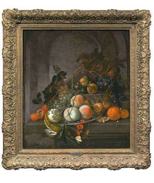 Still life with fruit on a stone ledge in front of a niche