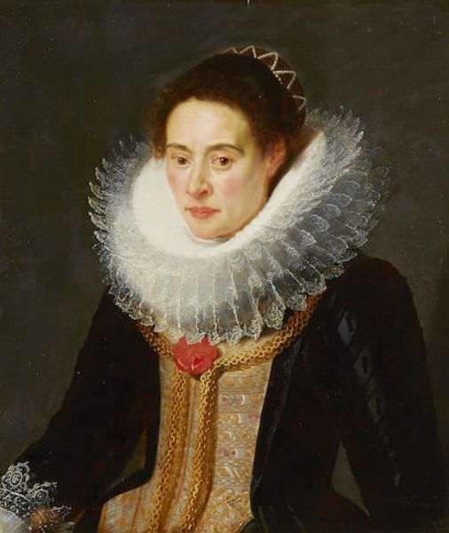 Portrait of a lady in a black dress with gold embroidery