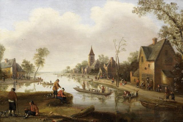 A river landscape with figures outside an inn and fishermen in boats, a town beyond