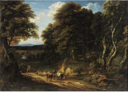 | A WOODED LANDSCAPE WITH A DROVER AND TWO HEIFERS ON A ROAD, TWO ANGLERS ON THE BANK OF A RIVER BEYOND | |