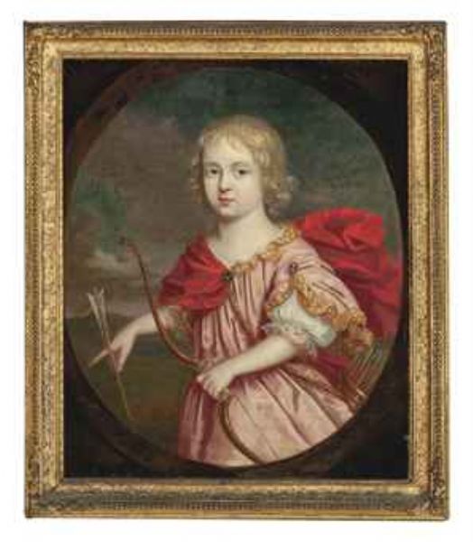 | Portrait of a young girl as Cupid, in a gold-trimmed pink dress, with a red wrap, a feigned oval | |