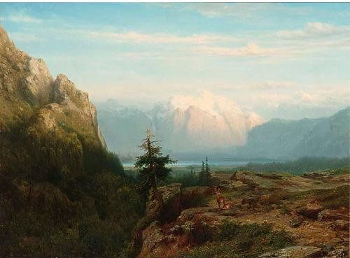 A MOUNTAINOUS LANDSCAPE WITH DEER