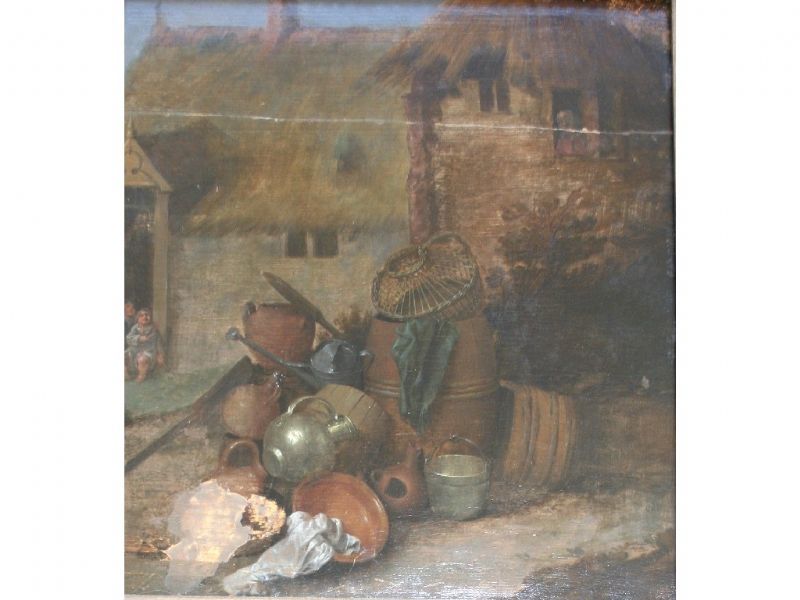 | BOWLS, VESSELS AND FLAGONS BY A BARREL IN A COTTAGE YARD | |
