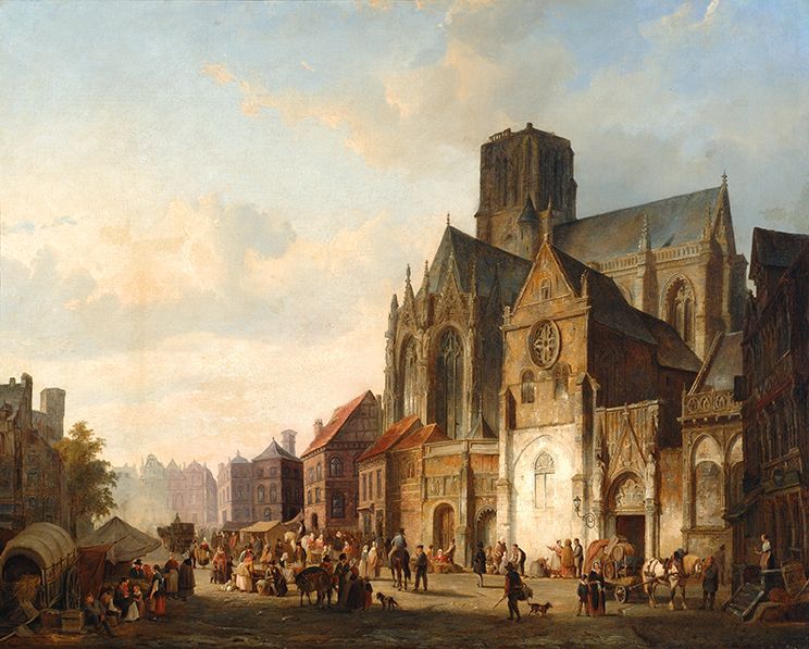 | A view of a city with many figures on a church square | |