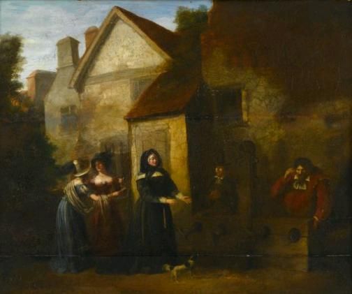 VILLAGE SCENE WITH PRISONERS IN STOCKADE AND ONLOOKERS