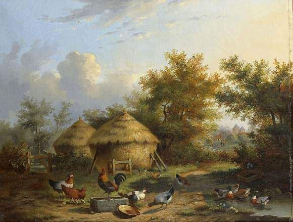 Poules et canards près d'une marre