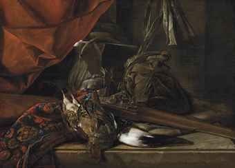 | A partridge, a hunting horn, a musket and game bags on a partly draped stone ledge | |