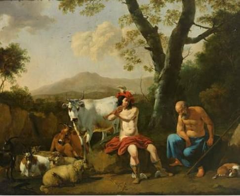| Merkur schläfert Argus mit seiner Musik ein. Im Hintergrund die von Juno in eine Kuh verwandelte Io, Geliebte des Jupiter. | |