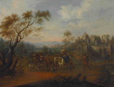 Bauernpaar mit Vieh auf der Landstraße vor der Stadt