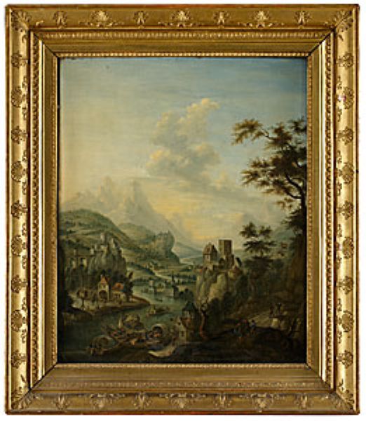 HÖGLÄNT LANDSKAP MED FIGURER VID BORG.