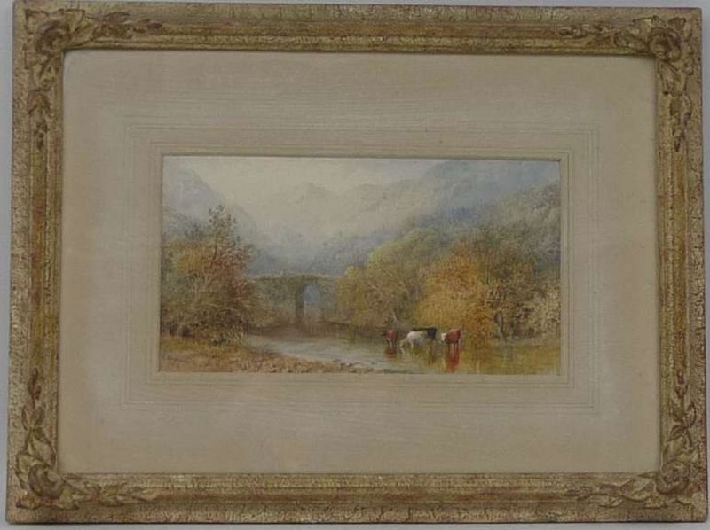 | a Welsh landscape with a bridge, and cattle in a stream, with mountains in the background | |