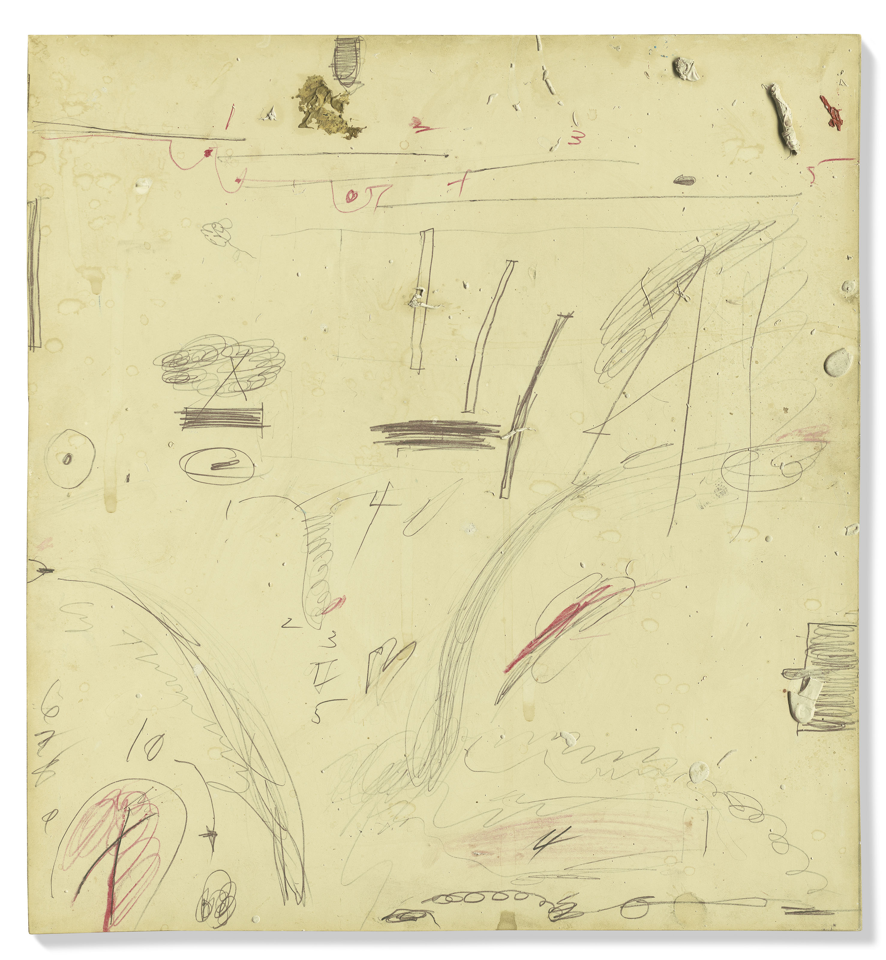 | Graphite wax crayon and oil-based house paint on paper laid on board | |