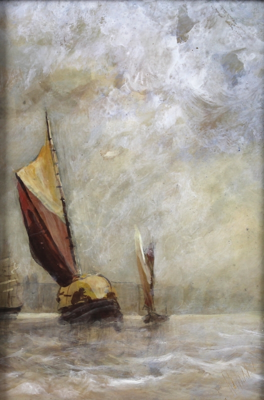 | a study of sailboats off a coastline, with cliffs in the background | |