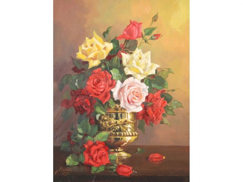 Still life with roses in a metallic vase