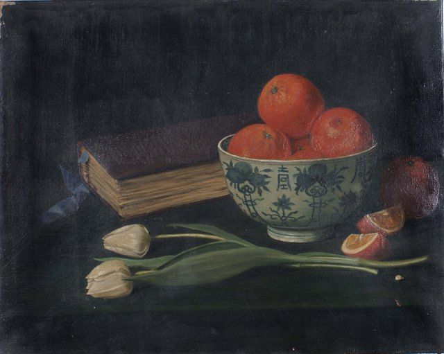 Still life with a Delft blue and white bowl of oranges and two white tulips