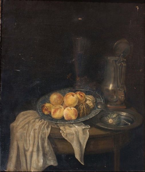 Still life with a pewter tankard and a blue and white Delft dish with gourds and nectarines