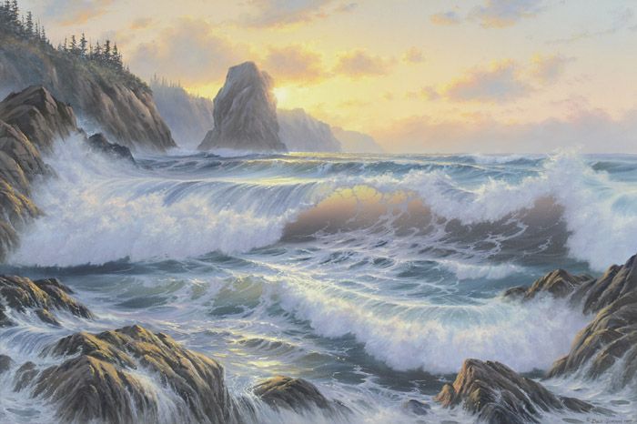 | Northwest Seascape at sunrise with translucent waves crashing on a rocky shore | |