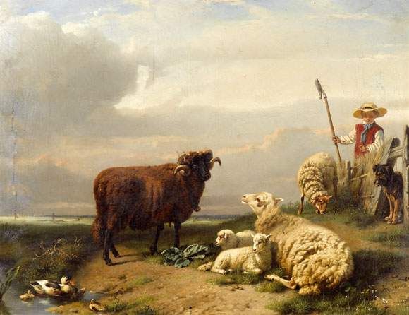 Berger, bélier, brebis et agneaux