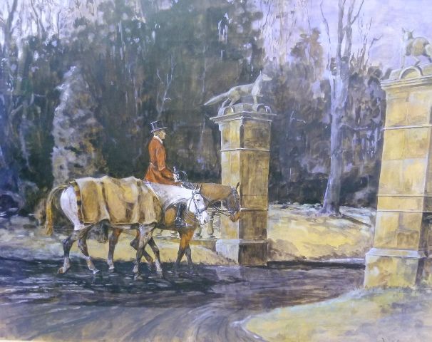 Duties Done, two hunters and mount returning home from the hunt, through stately gates