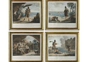 SATZ VON VIER SELTENEN FARBRADIERUNGEN EINER SERIE ZUR GESCHICHTE ROBINSONS