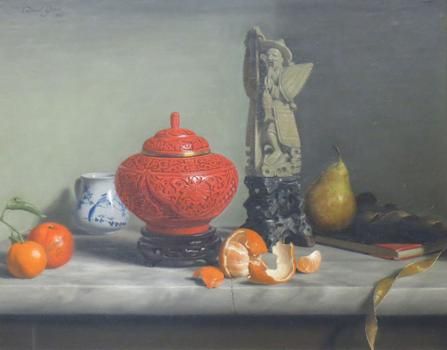 Still Life of Fruit and Asian Objects on a Marble Ledge
