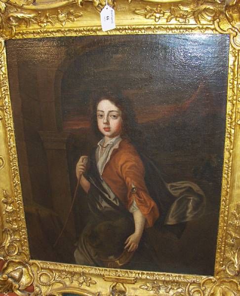 Portrait of a boy, beside a stone arch and with a dog at his side