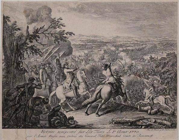 | Victoire remprteé sur les Turcs le 1. aout 1770 par L'Armée Russe ordres du Genera Feld-Marechal Comte de Romanzoff | |