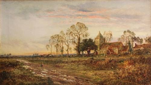 A view of a country church at sunset