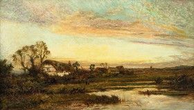 FIGURES BY A COTTAGE, SUNSET