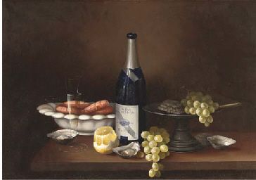 A still life with shrimps, grapes and a bottle of Riesling