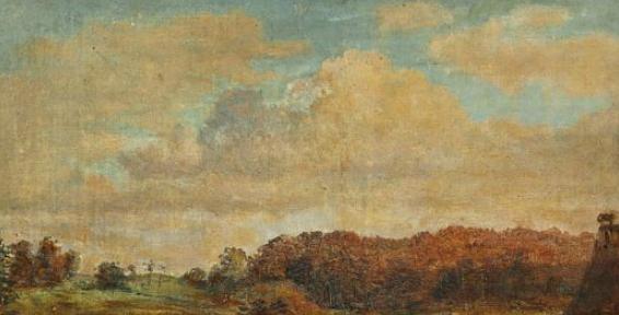 | A woodland scene, in the foreground the roof of a house | |