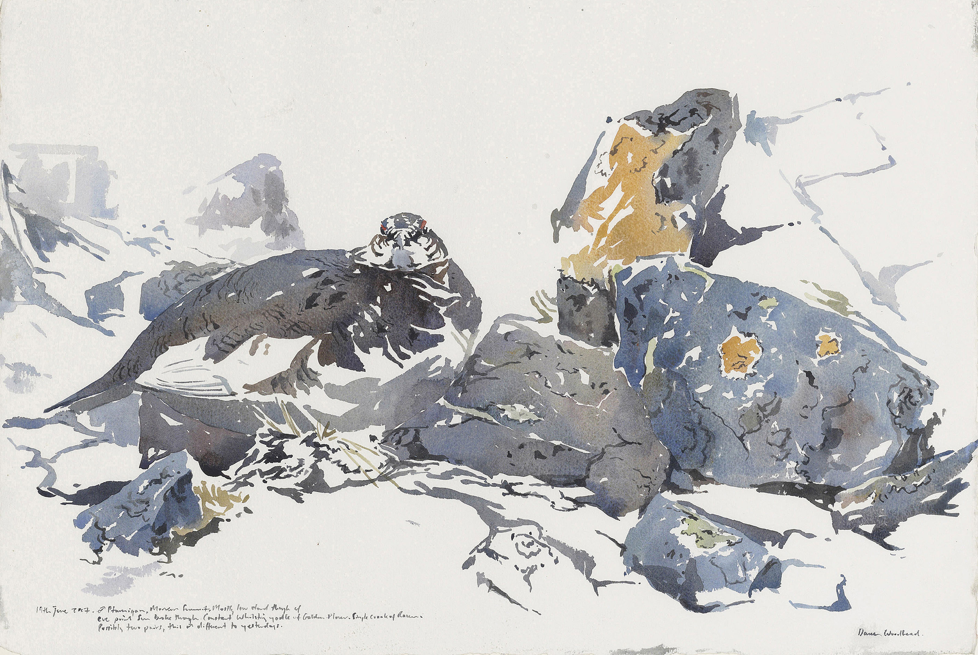 | Two ptarmigan; peregrine falcon; ptarmigan | |