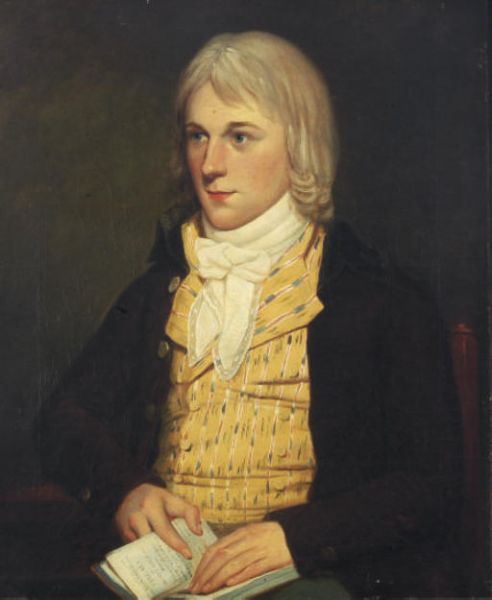 | Portrait of a gentleman, bust-length, seated in a yellow vest and brown coat, holding a book of poetry | |