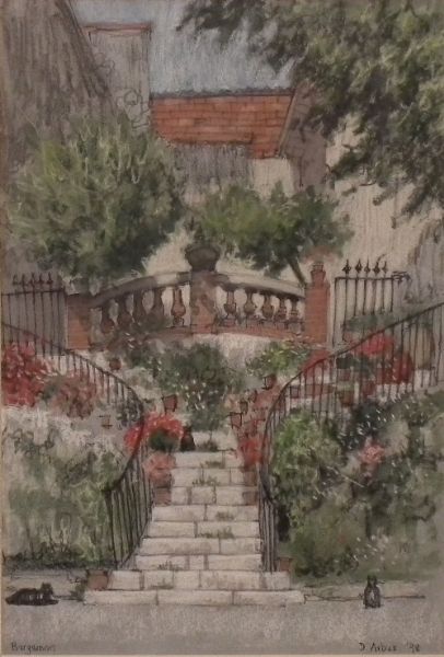 Pen ink, watercolour and pastel
