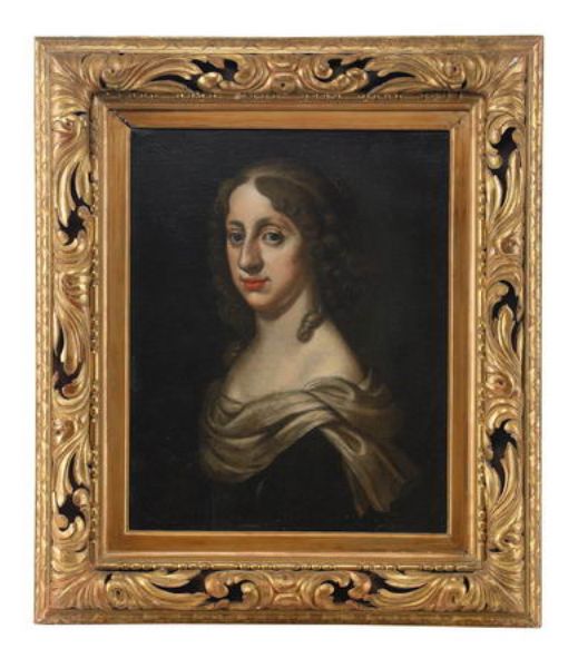 | Porträtt av drottning Kristina (1626-1689) iklädd svart klänning och vit sjal - midjebild | |
