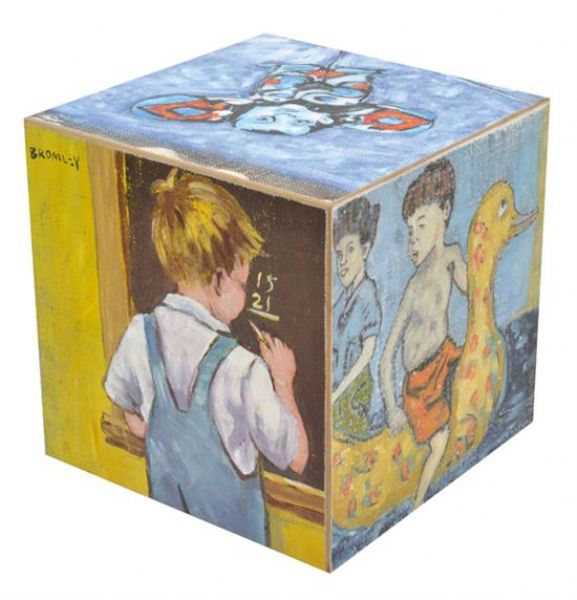 | A painted cube depicting various scenes including children at play | |