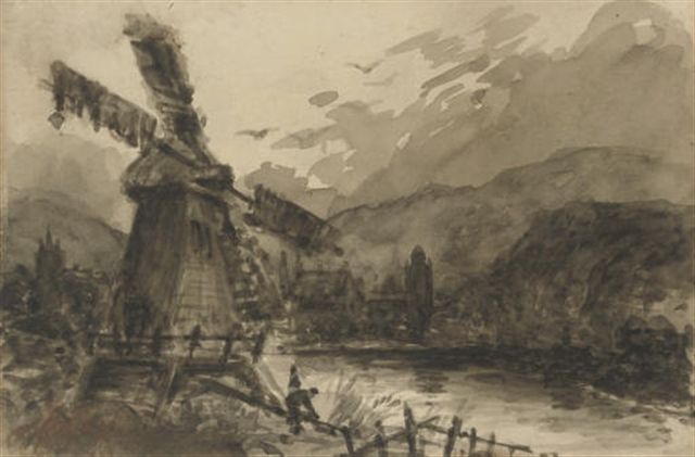 A windmill with figures in the foreground