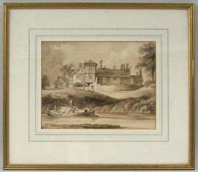 Elizabethan manor house, by a river, with figures in a barge