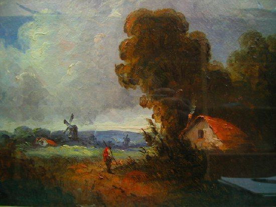 Figure Outside Cottage in Rural Setting with Windmill in Distance