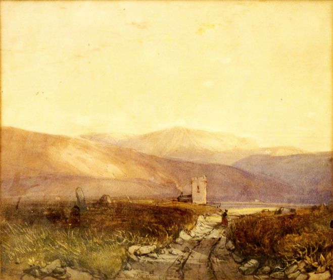 A MOUNTAINOUS LANDSCAPE WITH A FIGURE NEAR A TOWER