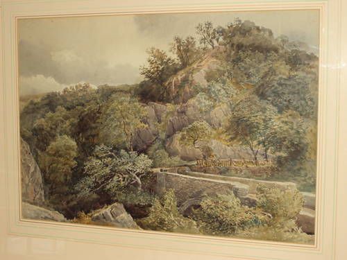 | Wooded rocky landscape, with stone bridge over a river gorge | |