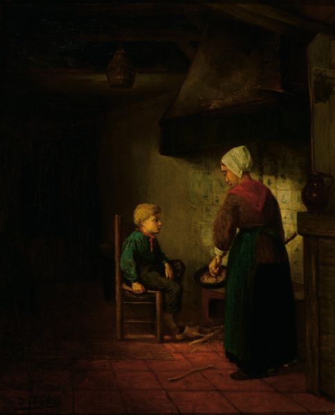 Moeder en zoon in een boereninterieur