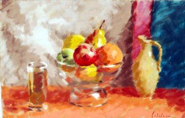 Still life study of fruit, a jug and a glass