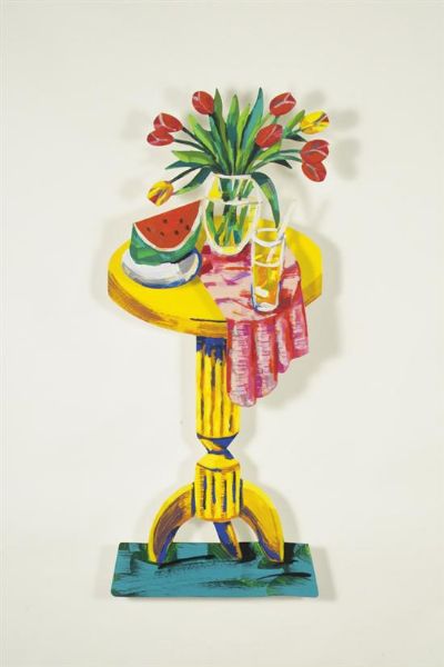 Still life with vase of flowers and watermelon painted metal