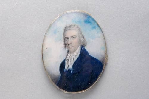 | A Gentleman, wearing blue coat, spotted white waistcoat and tied cravat, his hair powdered, against a sky background | |