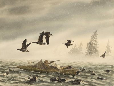 | ''Laid Out Off Whiskey Creek'' - Netarts Bay, Oregon (1972), hunter with geese in a snow flurry | |