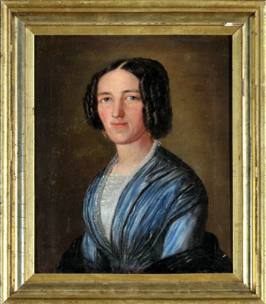 Portrait einer Dame im blauen Kleid in Dreiviertel-Ansicht